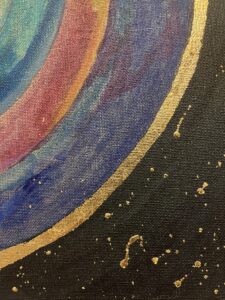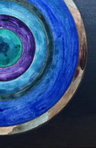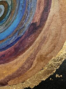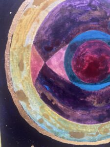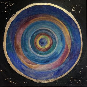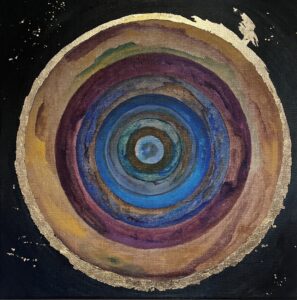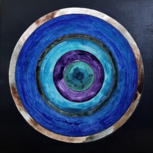 ŹRENICA KOSMOSU/ PUPIL OF THE COSMOS, technika mieszana: akryl i szlagmetal/ mixed media: acryilic and molded metal, wym./dim. 25 cm x 25 cm, 2025.
