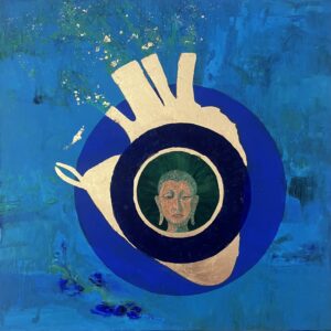 ŹRENICA SERCA/ PUPIL OF THE HEART, technika mieszana: akryl, szlagmetal i papier czerpany/ mixed media: acrylic, molded metal and handmade paper, wym./dim. 80 cm x 80 cm, 2026